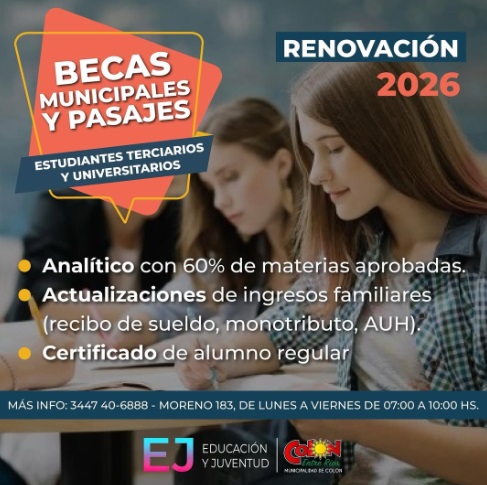 El llamado para nuevos aspirantes a becas y pasajes 2026 está dirigido a estudiantes que comienzan o continúan carreras terciarias o universitarias. Los turnos para ingresantes se otorgarán del 5 al 23 de enero de 2026, de 7 a 10 horas, en Moreno 183, de Leer mas...