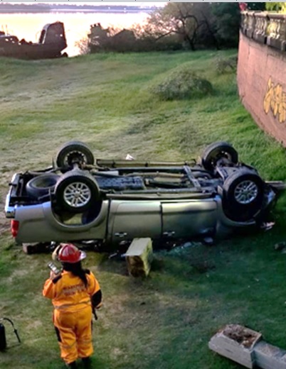 EL PRÓCER DE QUIROZ LA HIZO, LOS BORRACHOS LA ROMPEN. Daños en la balaustrada del parque Quiroz, y graves lesiones de un ocupante de la camioneta.